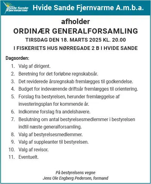 Hvide Sande Fjernvarme A.m.b.a. afholder ordinær generalforsamling på Fiskeriets Hus, torsdag den 21. marts klokken 20:00. Dagsorden ifølge selskabets vedtægter. Vel mødt