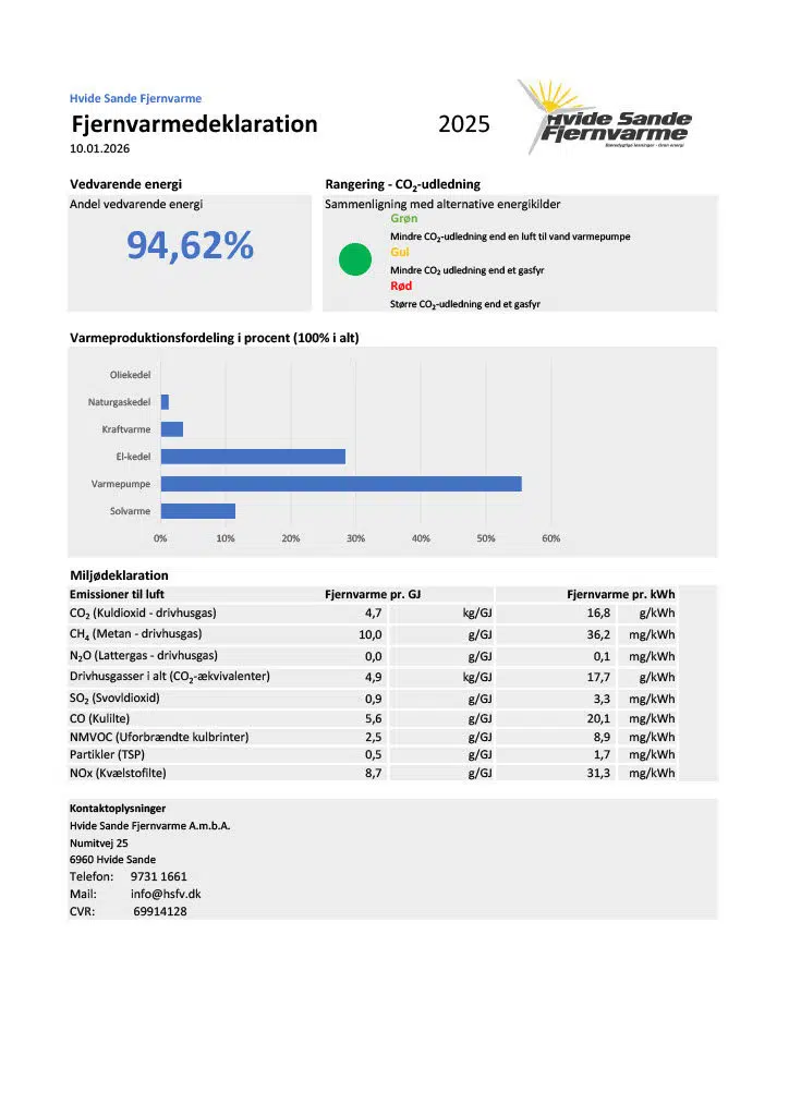 I 2025 har Hvide Sande Fjernvarme igen opnået et tilfredstillende grønt resultat for produktionen af fjernvarme til vores forbrugere. (se miljødeklarationen herunder).