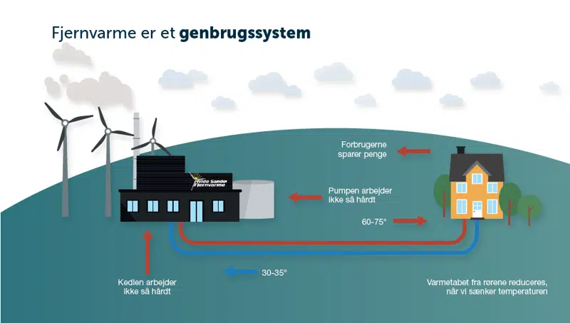 Hvis du bor tæt på værket i Hvide Sande, er fremløbstemperaturen på fjernvarmen højere, end hvis du bor længere væk. Derfor stiller vi også forskellige krav til returløbstemperaturen.
